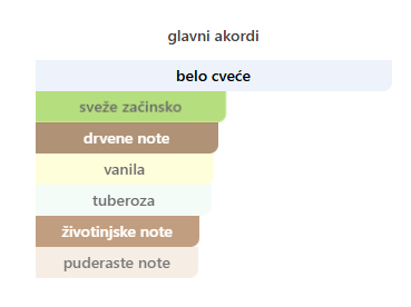 - Visoke: Muškatni orah, Gardenija, Cvijet narandže, Zelene note, Bergamot