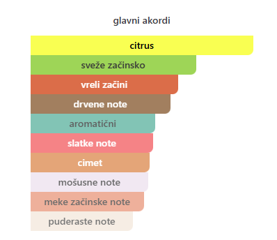 - Bazne: Mošus, Drvene note, Sandalovo drvo, Vetiver