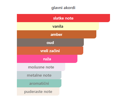 - Bazne: Tonka, Šećerna trska, Amber, Beli mošus, Mahovina