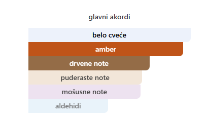 Cvetni miris za žene. Otvara se jasminom, prelazi u srce sa kašmeranom i solarnim notama, dok se završava toplom bazom od belog ambera.