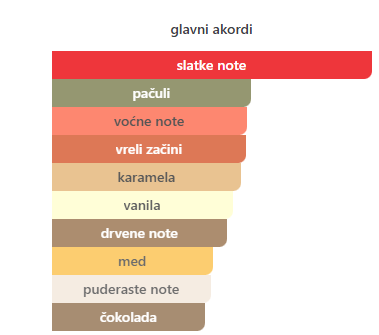 - Bazne: Pačuli, Čokolada, Karamela, Vanila, Mahune Tonke, Amber, Mošus, Sandalovo drvo
