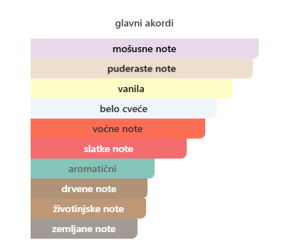 Chypre-voćni miris za žene, kreacija Sonie Constant, predstavlja novu intenzivnu interpretaciju kultne linije For Her. Otvara se sočnim tonovima breskve i svežim kalabrijskim bergamotom, stvarajući voćno-citrusni uvod. Srce parfema obogaćeno je belim cvećem i prepoznatljivim mošusom, koji daju dubinu i ženstvenu eleganciju. Baza se razvija u senzualnu kombinaciju vanile i vetivera, pružajući toplinu, zemljanu notu i dugotrajan karakter. For Her Intense odiše modernom snagom, sofisticiranošću i zavodljivom privlačnošću.
