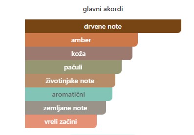 Otvaranje parfema donosi intenzivnu kožnu notu, koja odmah postavlja snažan i autoritativan ton. Srce kompozicije unosi zemljanu dubinu pačulija i aromatičnu svežinu čempresa, dodajući slojevitost i kontrast. Baza se oslanja na toplu i tamnu strukturu ambra, drvenih nota i vetivera, koji parfemu daju trajnost, eleganciju i muževnu ozbiljnost.