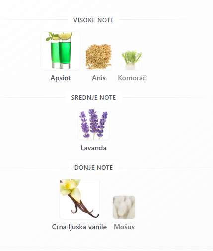 Otvaranje donosi osvežavajuću iskru mente i bergamota, stvarajući živahnu i energičnu atmosferu. Srce parfema otkriva aromatičnu toplinu lavande, obogaćenu balzamičnim i blago slatkastim akcentom benzoin smole. Baza se oslanja na slatku dubinu vanilije i tonke, koje parfemu daju kremastu mekoću, senzualnost i dugotrajnost.