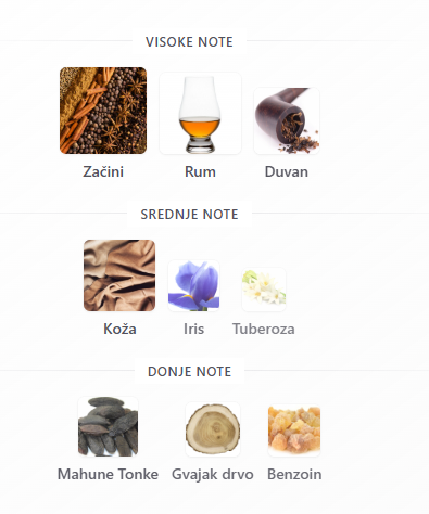 - Bazne note: Olibanum, Vanilija, Amber, Benzoin, Opoponaks, Oud (agar), Labdanum, Breza, Mošus, Ambergris, Maltol