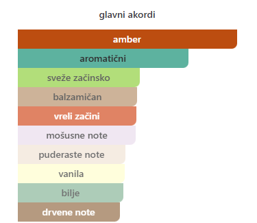 - Bazne: Ambergris, Listovi pačulija, Labdanum, Mošus, Sandalovo drvo