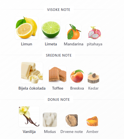- Gornje note: Limun, Limeta, Mandarina, Pitahaya (dragon fruit)